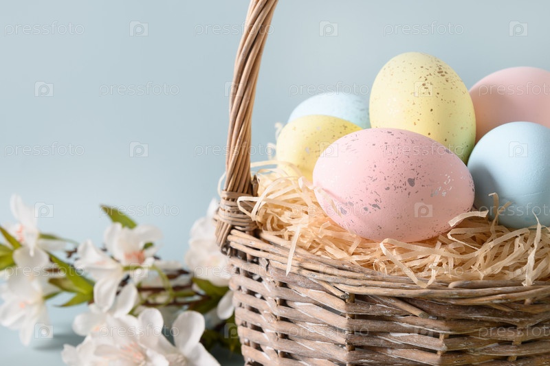 Пасхальная плетеная корзина с пастельными яйцами, цветущими весенними цветами для счастливого праздника и празднования на синем фоне. Закрыть. Открытка