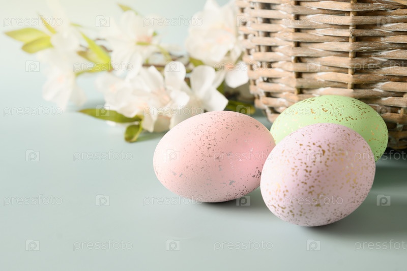 Пасхальная открытка с яйцами, плетеной корзиной, весенними цветами на синем фоне. Закрыть. Скопируйте пространство