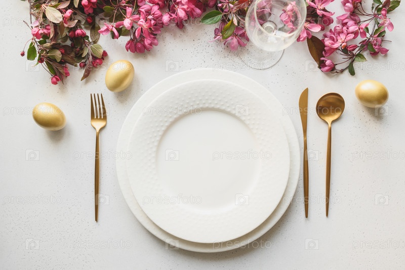Пасхальный праздничный ужин с золотыми яйцами, праздничной посудой и цветами