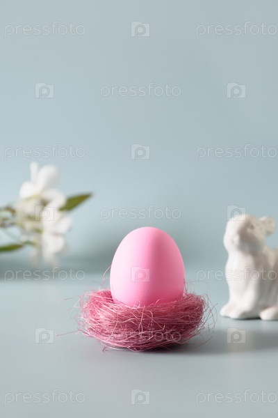 Пасхальное розовое яйцо в гнезде и кролик в весенней композиции на синем фоне. Вертикальный формат. Счастливой Пасхи