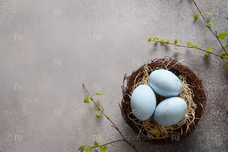 Пасхальные голубые яйца в гнезде и весенние березовые веточки на сером фоне. Вид сверху. Скопируйте пространство