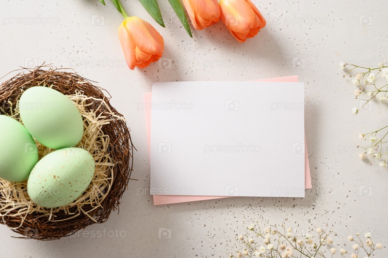 Пасхальная открытка с зелеными яйцами в декоративном гнезде на белом фоне. Вид сверху. Открытка с копией пространства