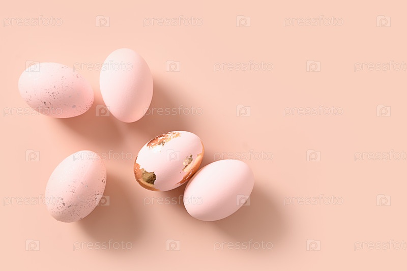 Розовые пастельные яйца на розовом монохромном фоне. Плоская укладка. Счастливой Пасхи минималистская открытка с копией пространства. Вид сверху. Концепция окрашивания яиц