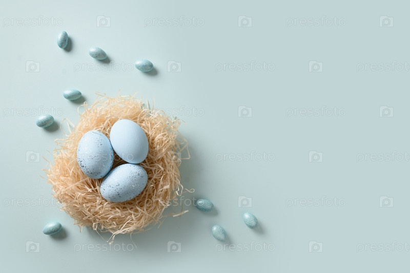 Пасхальные голубые яйца в гнезде на синем фоне. Открытка с копией пространства. Вид сверху