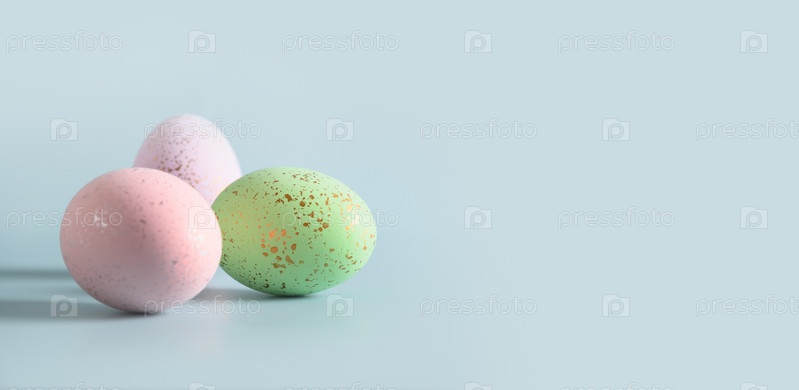 Три декоративных пастельных яйца на синем фоне. Поздравительная открытка с Пасхой с копией пространства. Баннер. Приглашение