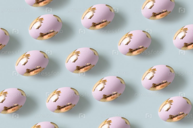 Счастливые пасхальные фиолетовые яйца украшены золотой поталью. Бесшовный узор