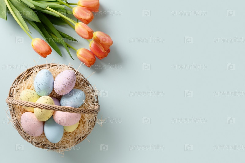 Пасхальная открытка с яйцами в корзине и тюльпанами на синем фоне. Вид сверху. Скопируйте пространство