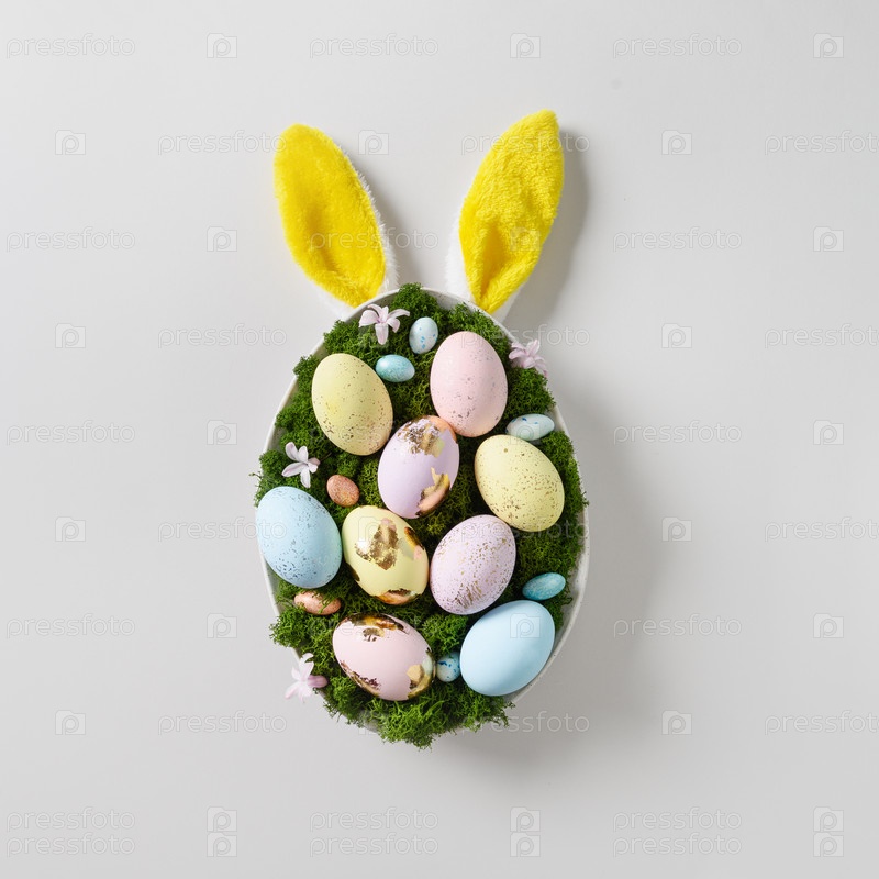 Пасхальная композиция своими руками в тарелке для праздничного стола с кроликом, яйцами, мхом и весенними цветами