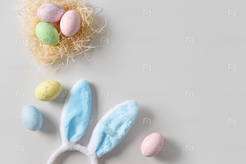 Уши пасхального кролика, гнездо и пастельные красочные яйца на сером фоне. Вид сверху. Плоская укладка. Счастливая весенняя открытка с копией пространства