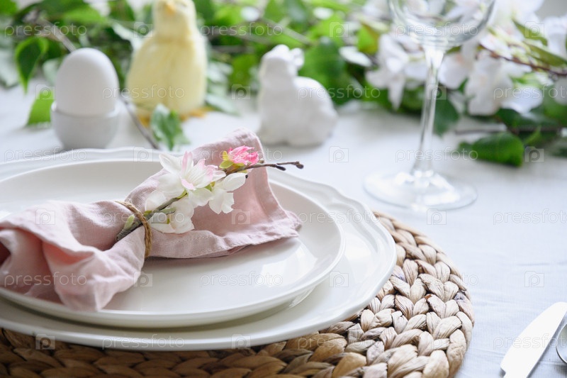 Сервировка пасхального стола с желтым цыпленком, украшениями, свежими цветами и яйцами. Элегантный ужин. Закрыть