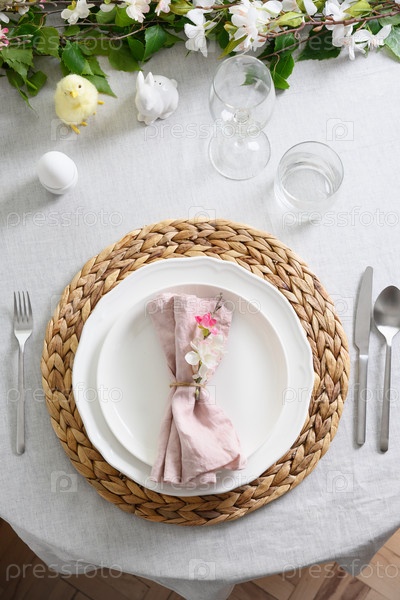 Сервировка пасхального стола с желтым цыпленком, свежими цветами и яйцами. Закрыть