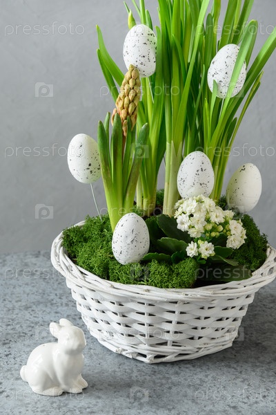 Пасхальная весенняя цветочная композиция в цветочном горшке с желтым нарциссом и белым кроликом, яйца на сером столе. Праздничная вертикальная открытка
