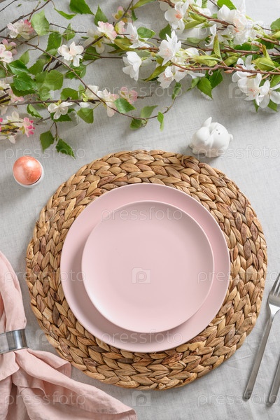 Пасхальный розовый ужин с белым кроликом, свежими весенними цветами и яйцом. Элегантная сервировка стола. Вид сверху. Традиция христианской религии