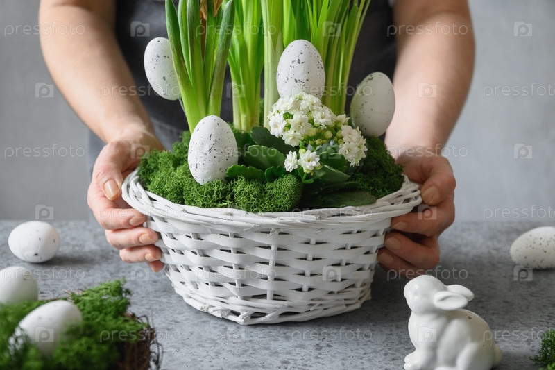 Центральное место пасхального стола с праздничными яйцами, мхом и кроликом. Весенняя цветочная мастерская