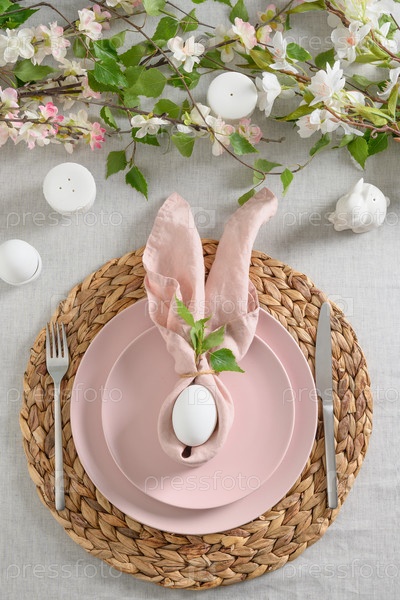 Сервировка пасхального стола с желтым цыпленком, украшениями, свежими цветами и яйцами. Элегантный ужин дома. Закрыть