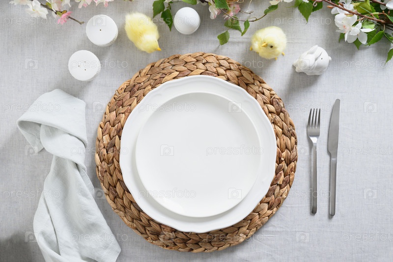 Сервировка пасхального стола с желтым цыпленком, яйцами, живыми цветами на серой льняной скатерти