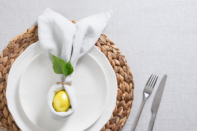 Сервировка пасхального стола с желтыми яйцами на льняной скатерти. Элегантный праздничный ужин. Вид сверху. Традиция христианской религии. Скопируйте пространство