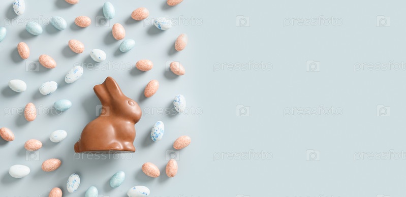 Пасхальный баннер со сладостями в виде яиц и шоколадного кролика на синем фоне с копировальным пространством. Вид сверху. Поздравительная открытка с Пасхой