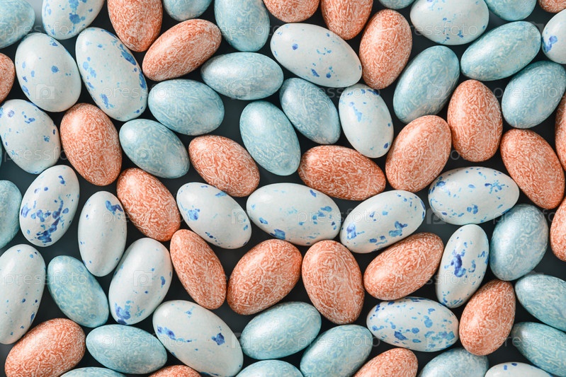 Пасхальные шоколадные конфеты в виде голубых и розовых яиц. Продовольственный фон. Религиозная традиция. Вид сверху