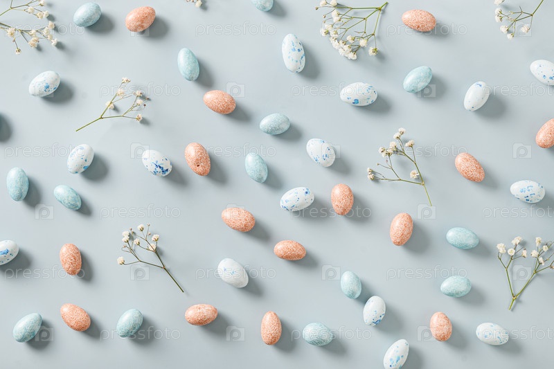 Пасхальный узор со сладостями в виде шоколадных яиц и цветов гипсофилы на синем фоне. Вид сверху. Плоская укладка