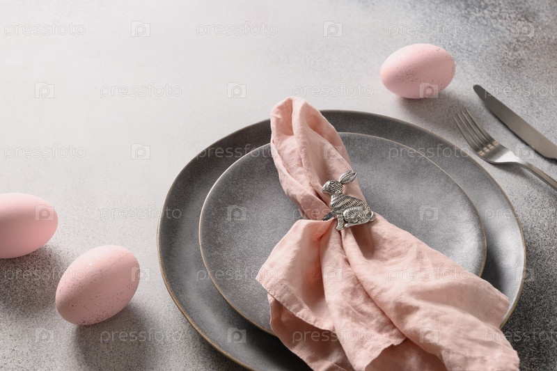Пасхальный ужин с розовым яйцом, элегантная сервировка стола. Вид сверху. Скопируйте пространство