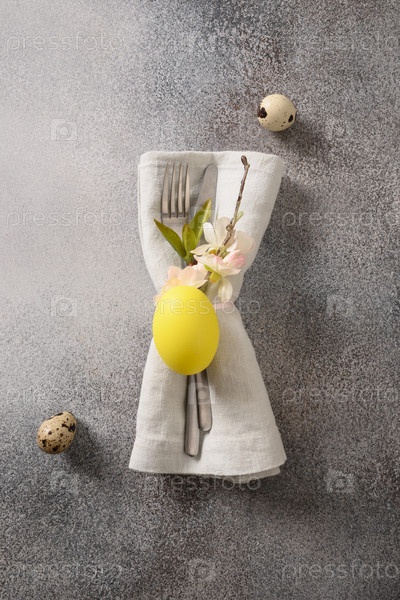 Столовые приборы с весенними украшениями, желтым яйцом и цветущими цветами для сервировки пасхального стола на сером фоне. Вид сверху. Вертикальный формат