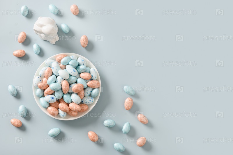 Пасхальные шоколадные конфеты яйца и белый кролик на синем фоне. Вид сверху. Плоская укладка. Поздравительная открытка с Пасхой. Скопируйте пространство