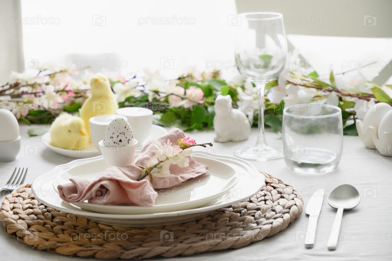 Сервировка пасхального стола с желтым цыпленком, украшениями, свежими цветами и яйцами. Элегантный ужин дома