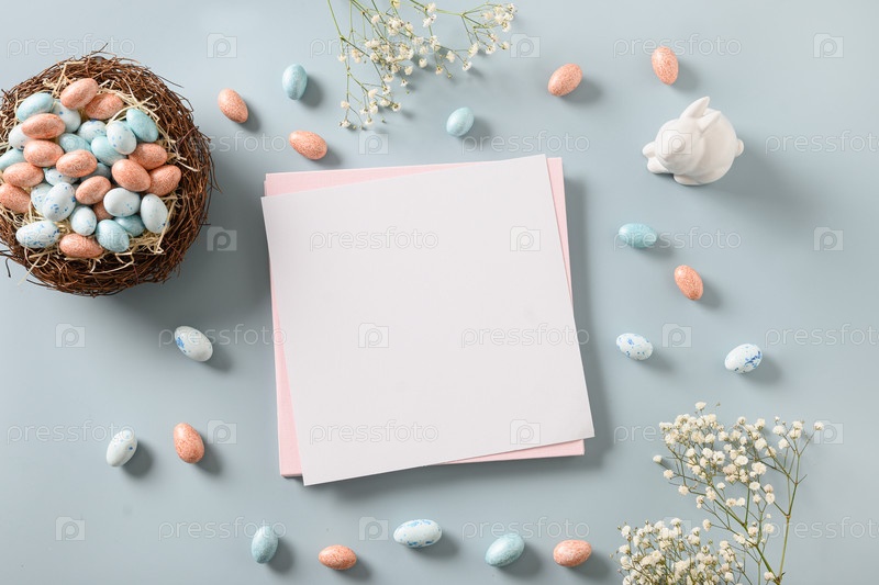 Пасхальная заготовка для поздравления с пастельными шоколадными конфетами в виде яиц, гнезда и кролика
