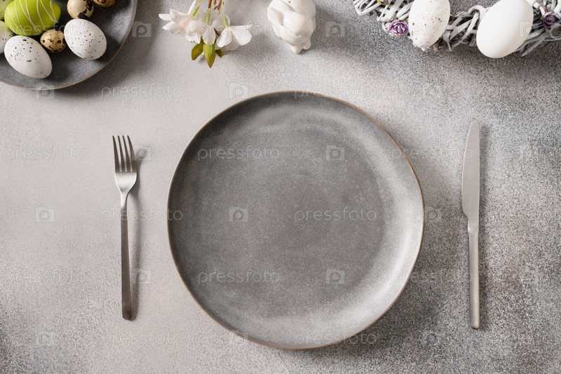 Пасхальная праздничная сервировка с серой тарелкой, весенними цветами и зелеными разноцветными яйцами. Вид сверху. Скопируйте пространство