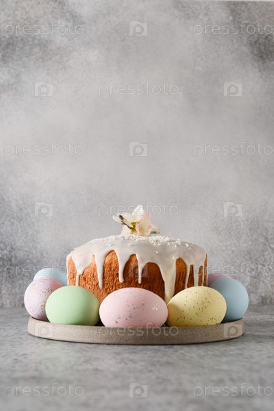 Пасхальный православный кулич украшен яйцами и весенними цветами на сером фоне. Вертикальный формат. Праздники традиционный десерт. христианский обычай