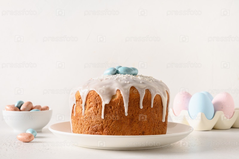 Пасхальный православный кулич украшен голубыми яйцами на белом фоне. Праздники традиционный десерт. христианский обычай