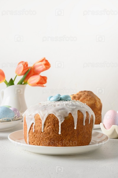 Пасхальный православный кулич, украшенный яйцами. христианский обычай