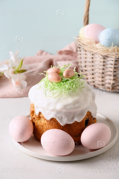 Домашний кулич, разноцветные яйца, пасхальная корзина для празднования религиозного обычая