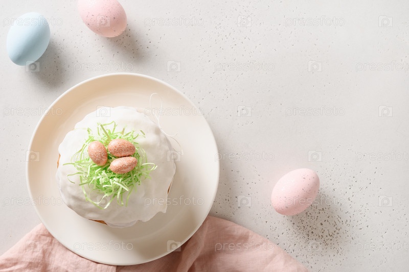 Пасхальный кулич и красочные розовые яйца на белом фоне