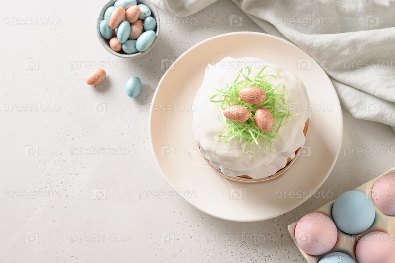 Пасхальный кулич и красочные розовые яйца на белом фоне. Место для текста
