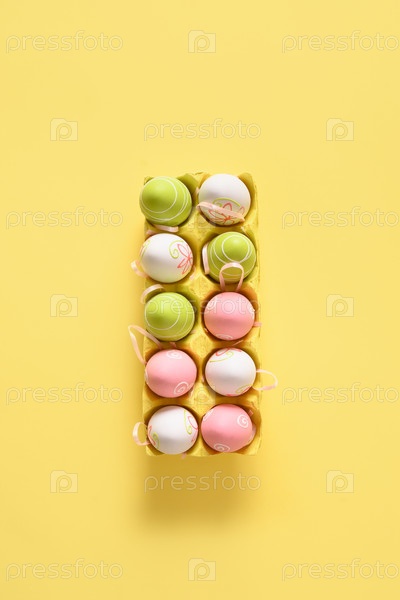 Пасхальные пастельные яйца в желтой картонной коробке на желтом