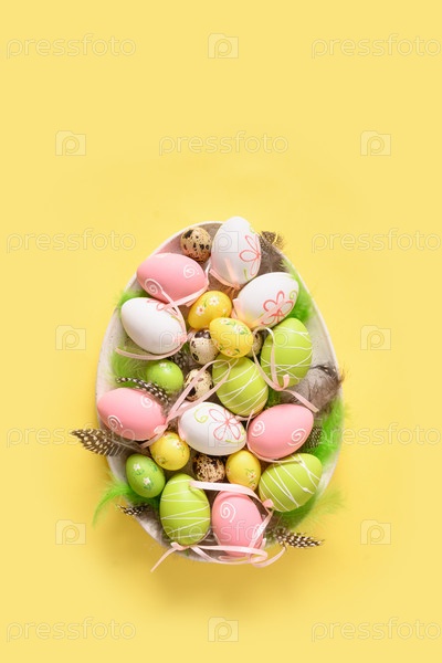 Красочные пастельные пасхальные яйца в тарелке как яйца. Пасхальная открытка
