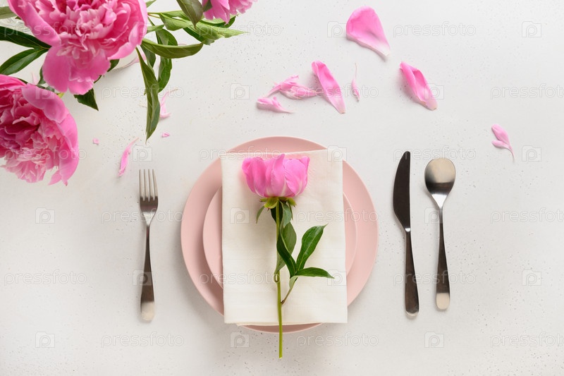 Весенняя сервировка стола с розовыми цветами пиона на белом столе. Вид сверху