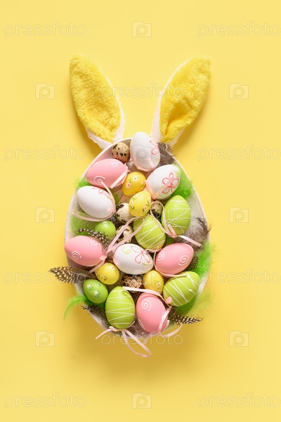 Красочные пастельные пасхальные яйца в тарелке и кроличьи уши на желтом. Пасхальная открытка