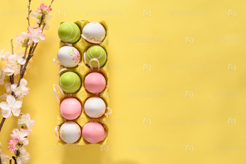 Пасхальные пастельные яйца в желтой картонной коробке и весенние цветущие цветы на желтом