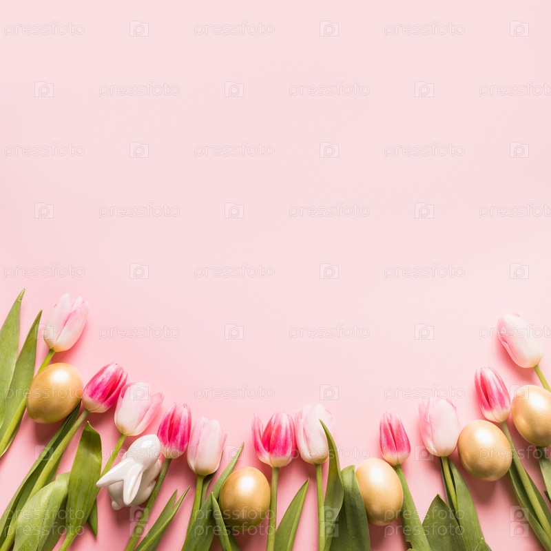Пасхальная открытка с тюльпанами, яйцами и кроликом на розовом фоне с копией пространства