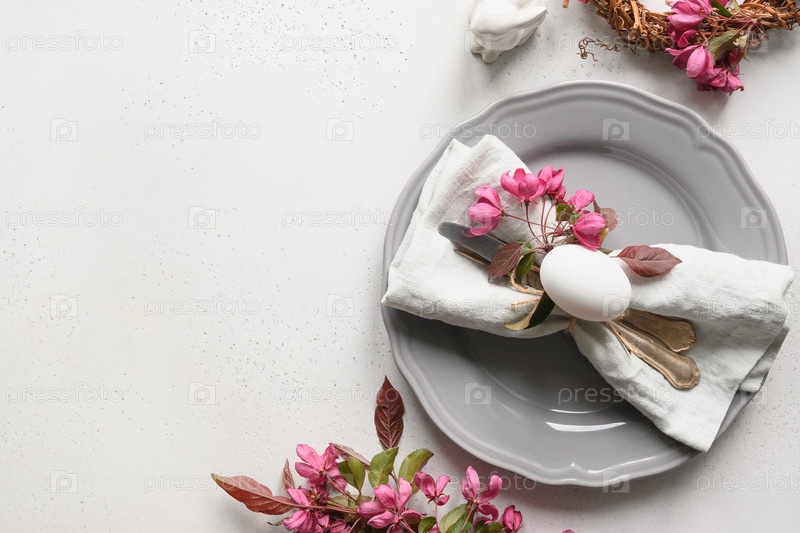 Сервировка пасхального стола с цветущими цветами яблони на белом столе
