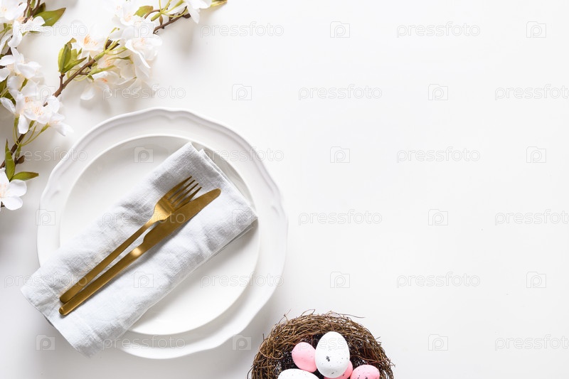 Сервировка пасхального стола с цветущими цветами на белом столе