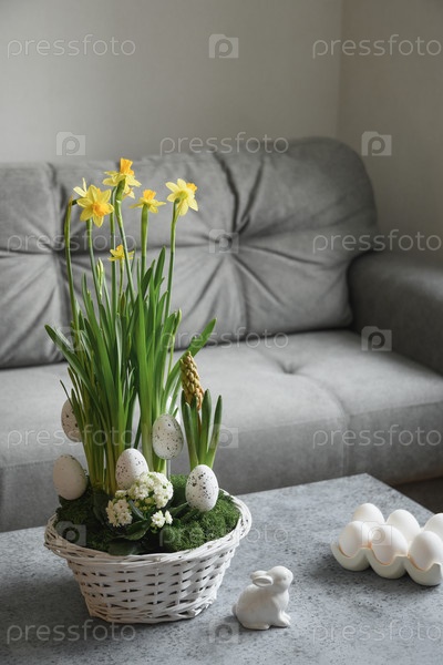 Весенний домашний интерьер с пасхальным деревом и вазой с крашеными яйцами. Карантин. Самоизоляция. Домашняя жизнь