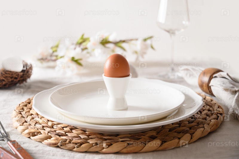 Весенняя стильная пасхальная сервировка с органическими яйцами, кроликом и цветущими цветами