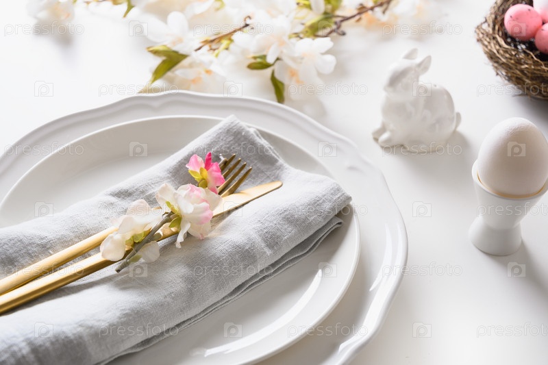 Сервировка пасхального стола с цветущими цветами на белом столе