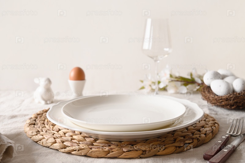 Весенняя стильная пасхальная сервировка с органическими яйцами, кроликом и цветущими цветами