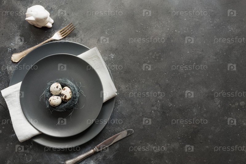 Сервировка пасхального стола с гнездом яиц в качестве декора в темноте. Вид сверху