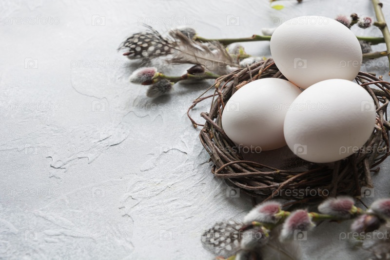Белые пасхальные яйца в гнезде и весенняя верба на винтажном столе